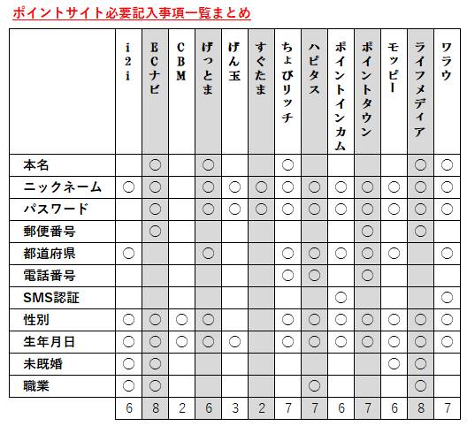 必要記入事項は、サイト毎に違うので一覧を紹介します。